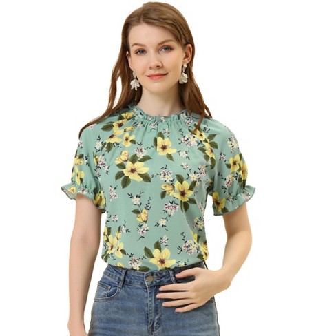 Allegra K Women s Floral Ruffled Short Sleeve Mock Neck Blouses Very well made.