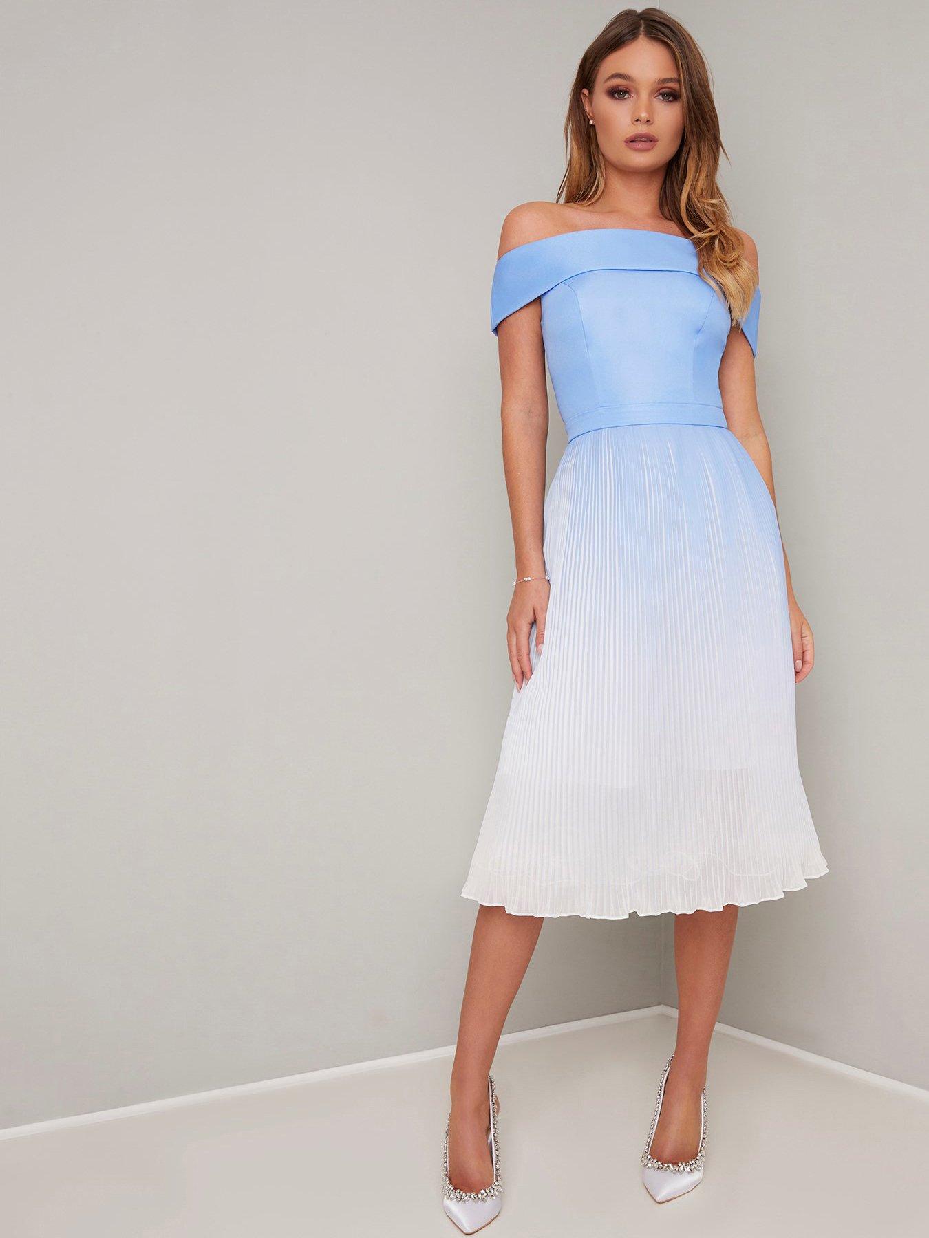 shirred bardot blouson sleeve prom midi dress in baby blue Very well made.