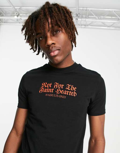 ASOS DESIGN slim shrunken fit t shirt in black cotton with gothic text print BLACK Very well made.